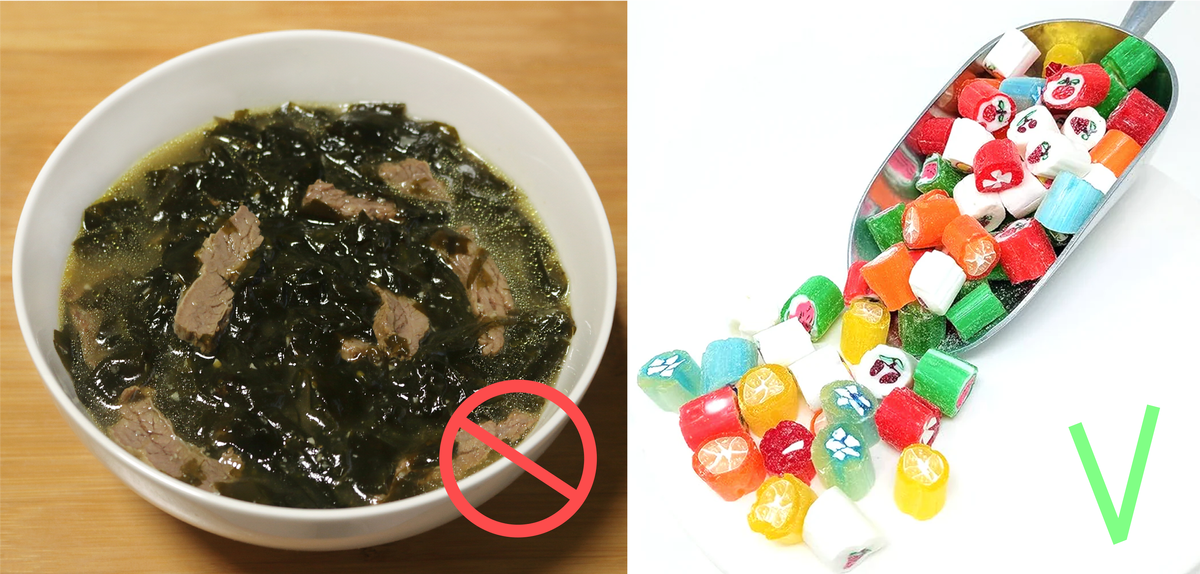 В этот день строго запрещено есть суп с морской капустой - Миёккук/미역국, так как считается, что он вымывает ответы из головы. А вот карамельные конфеты - да, потому что это, по мнению корейцев, приближает вас к сладкой мечте.