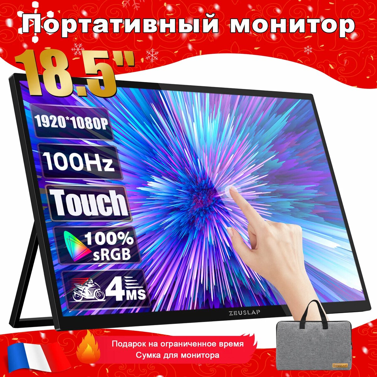 Портативный монитор ZEUSLAP 18.5" 100гц сенсорный экран - это надежный инструмент для работы и развлечений. Он имеет высокое качество изображения и удобное управление. Это делает его идеальным для разных задач.