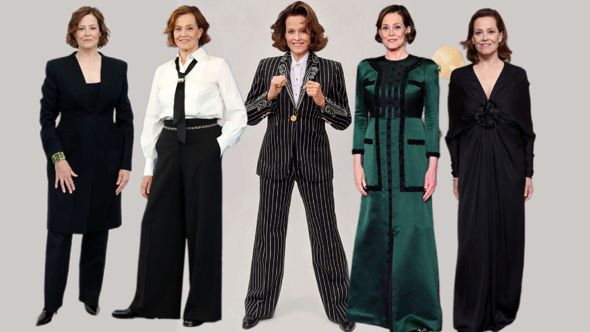 Сигурни Уивер с доминирующим во внешности Ян скорее знает, чем нет об этом. Она может позволить себе женственные наряды, подчеркнуть изгибы, даже если это не «песочные часы», почему бы и нет, но сохраняя вертикаль. Ткани я вижу у неё соответствуют рекомендациям, хотя бывало и нет. Тонкий трикотаж её совершенно не украшает. Далее вы увидите, почему.