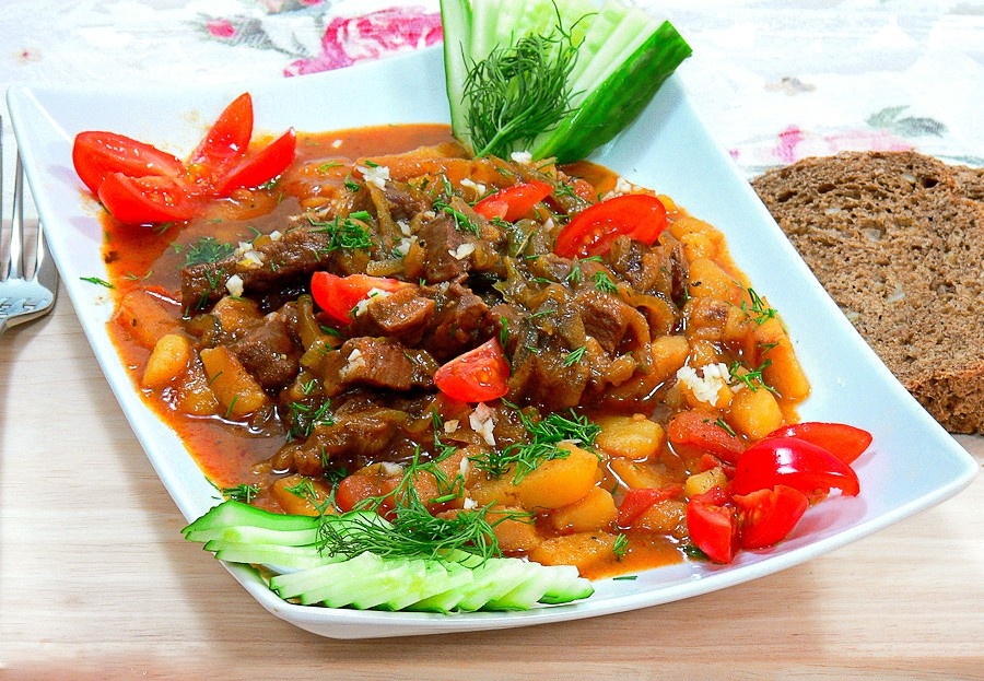 Азу из говядины Сытное и вкусное блюдо - азу из говядины. Рецепт такой простой, а как вкусно! Вы должны это попробовать. Продукты: Говядина - 1кг Масло растительное - 90-100г или масло топлёное - 90 г Томат-паста - 1,5 ст. ложки Лук репчатый - 250 г Мука - 1-1,25 ст. ложки Огурцы солёные - 300 г Картофель - 800 г Помидоры - 300 г Перец - 0,25-0,5 ч. ложки Соль - 1 ст. ложка Вода - 1 стакан или бульон - 1 стакан Чеснок - 3-4 зубчика Лавровый лист - 2-3 шт. Зелень - по вкусу Рецепт азу из говядины с солеными огурцами заключается в том, что кусочки мяса тушатся с овощами в остром томатном соусе. Как приготовить азу из говядины: Мясо помыть, осушить, зачистить от пленок и сухожилий и нарезать брусочками толщиной 1 см и длиной 3-4 см. Разогреть сковороду, налить 30 г (1,5-2 ст. ложки) растительного масла. Выложить мясо. Посолить, поперчить, перемешать. Обжарить, помешивая, на сковороде 10-15 минут на среднем огне. Разогреть другую сковороду. Добавить 20 г (1-1,5 ст. ложки) масла. Томатное п