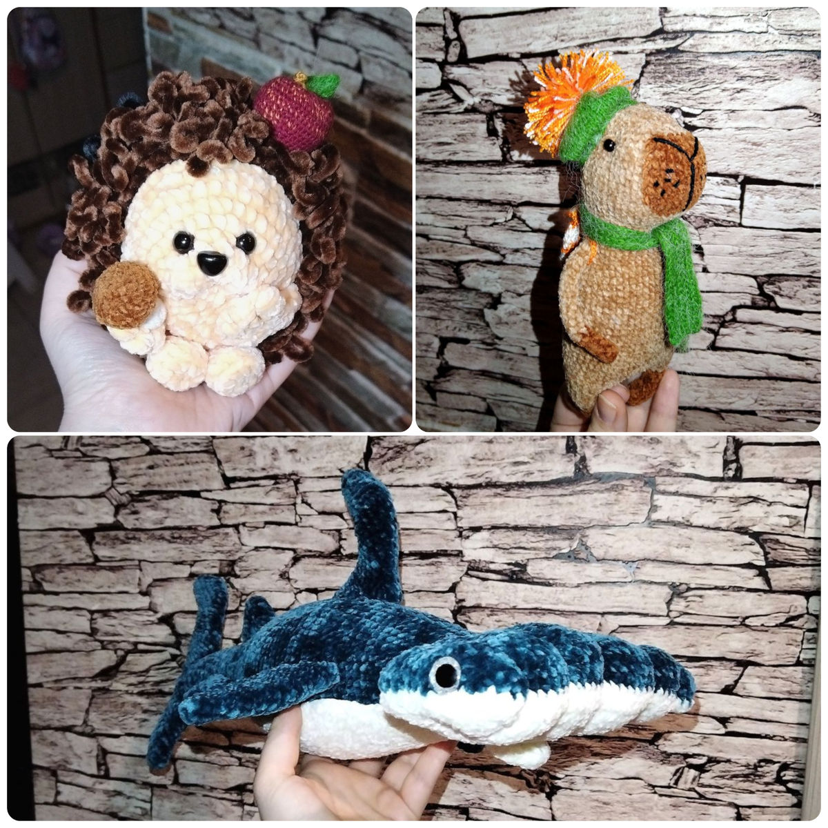 Так уж случилось, что коллекционированием в моей большой семье увлекаюсь не только я. Началось все с моего дедушки, у него огромная коллекция марок и небольшая коллекция монет. Теперь, все это храниться у моей мамы, а мы просто любим все это рассматривать. Моя младшая сестра коллекционирует акул и немножко акриловые фигурки любимых героев по любимым играм. Ну а моя мама собирает ежиков. Фото ее коллекции я пока не сделала, жду когда же у ежиков появится своя витринка. А еще у меня две дочки, которые коллекционируют мягкие игрушки, сейчас в основном связанные моими руками. В этом году я вязала подарки на 8-е марта своим самым родным и близким девочкам. Первым делом связала подарок сестре: вот такая Акула молот получилась))) Потом связала аж двух Ежиков, правда одного утащила дочка, так что подарком для мамули стал вот этот малыш: Дети запросили капибар. И вот тут пришлось поискать. Вариантов много, но тех, что приглянулись было значительно меньше. Наконец выбрала 2
