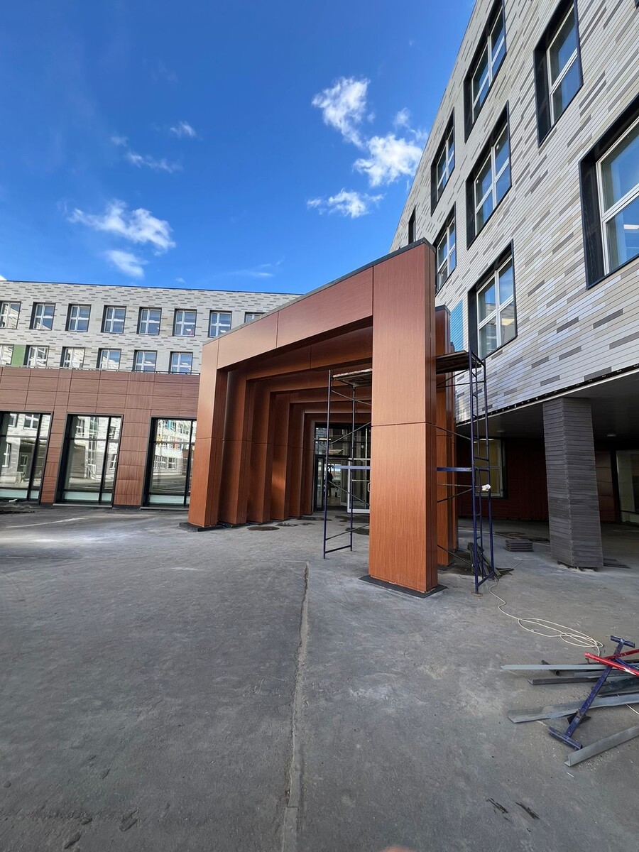 Две входные группы во внутреннем дворе здания выделены замысловатыми «порталами», облицованными алюминиевыми композитными панелями SIBALUX с текстурой и цветом американского ореха. КПП при входе на территорию учебного комплекса со стороны улицы, также частично облицованный панелями SIBALUX, разделяет учащихся на два потока: начальную и среднюю школы.