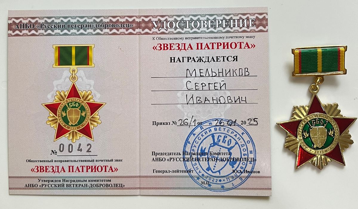 Мельников С. И. Награжден почетным знаком «Звезда патриота»