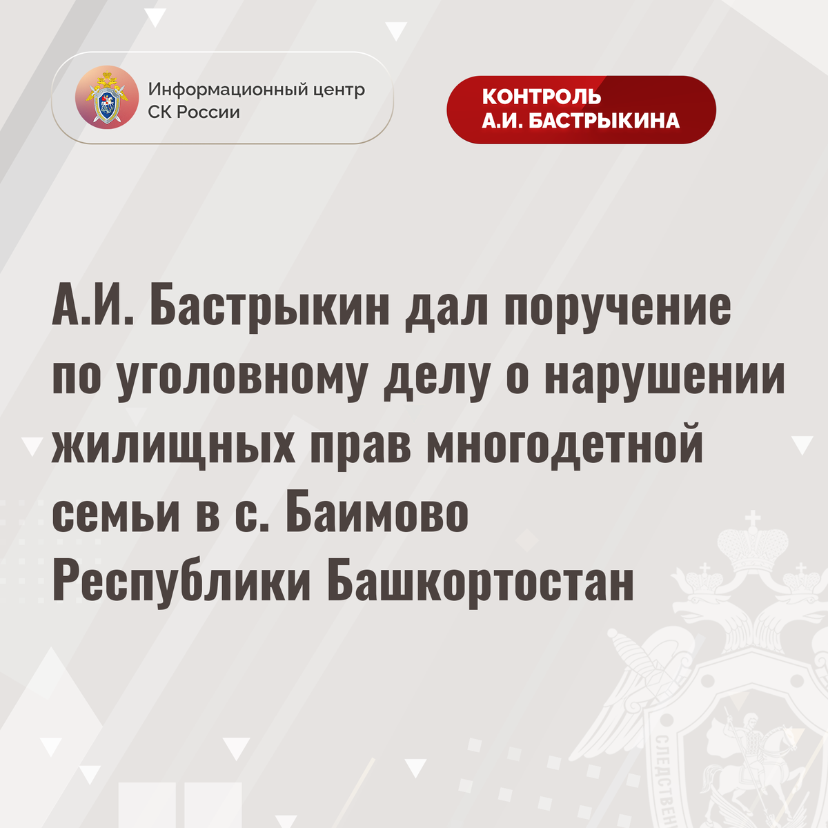 А.И. Бастрыкин дал поручение по уголовному делу о нарушении жилищных прав многодетной семьи в с. Баимово Республики Башкортостан