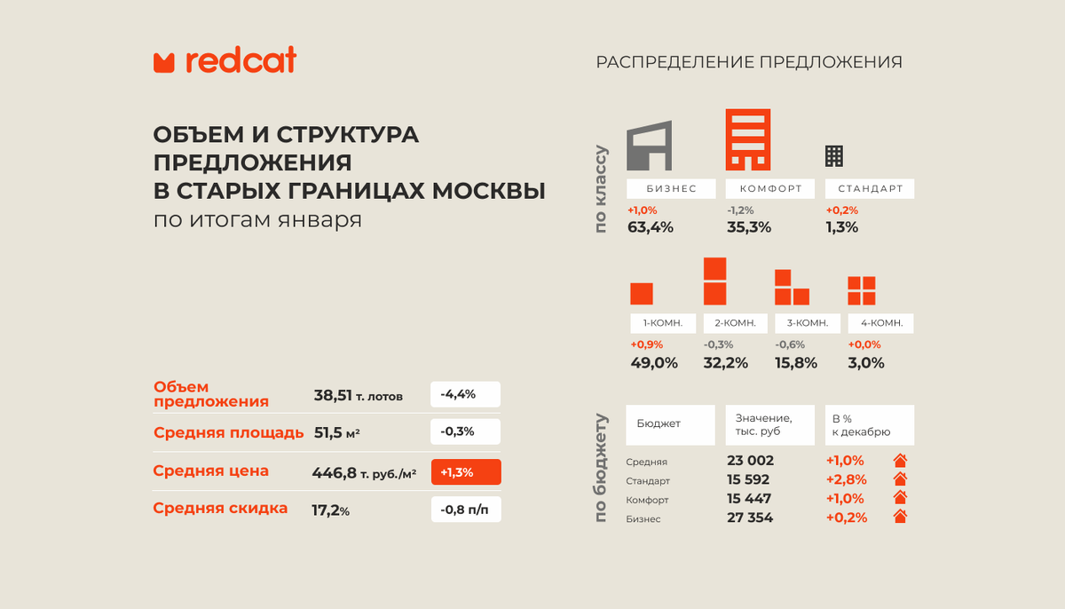 В январе активность девелоперов ожидаемо замедлилась, количество новых объектов за месяц сократилось на 46%, но по сравнению с прошлым годом, январь текущего в выигрыше – на рынок вышло в 1,5 раза больше корпусов. В течение месяца новые проекты на рынок не выходили, объемы пополнялись за счет 17 новых корпусов в уже реализуемых комплексах и 6 корпусов по программе реновации. Объем предложения продолжил начатое в сентябре снижение, за месяц откатился еще на 4,4%, и опустился до минимального с мая 2022 года уровня. Сейчас в старых границах экспонируется 38,51 тыс. квартир и апартаментов, это на 12,0% меньше, чем было в январе 2023 года. В январе предложение еще сильнее сместилось в сторону дорогого жилья и его доля снова обновила максимальный показатель, этому способствовало более активное сокращение количества выставленных лотов в доступных проектах. Доля бизнес-класса выросла на 1,0 п/п и составила 63,4%, доля комфорт-класса снизилась на 1,2 п/п и составила 35,3%, доля стандарт-класса