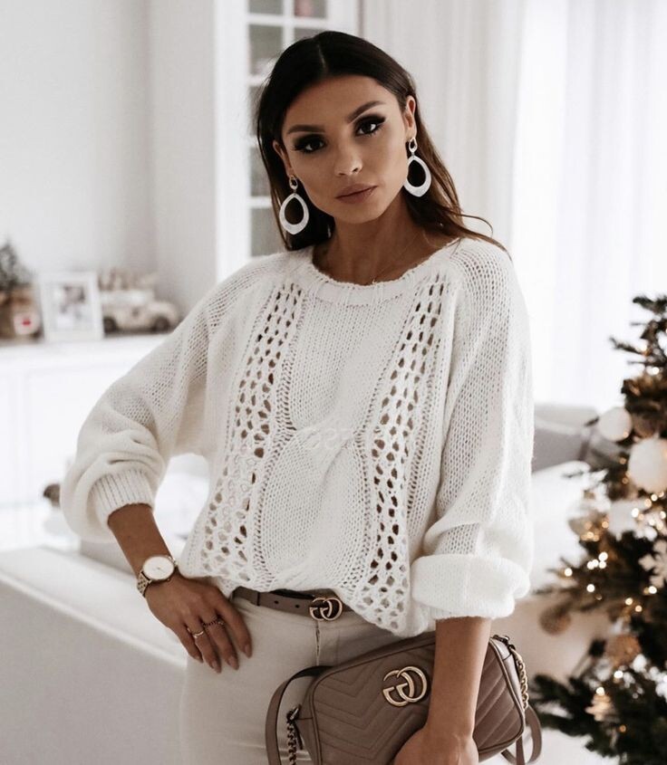 Этот модный джемпер с рукавами реглан впечатляет своей нежной отделкой по низу, выполненной с использованием ажурного узора. Такая деталь придаёт изделию особую изюминку и делает его стильным.