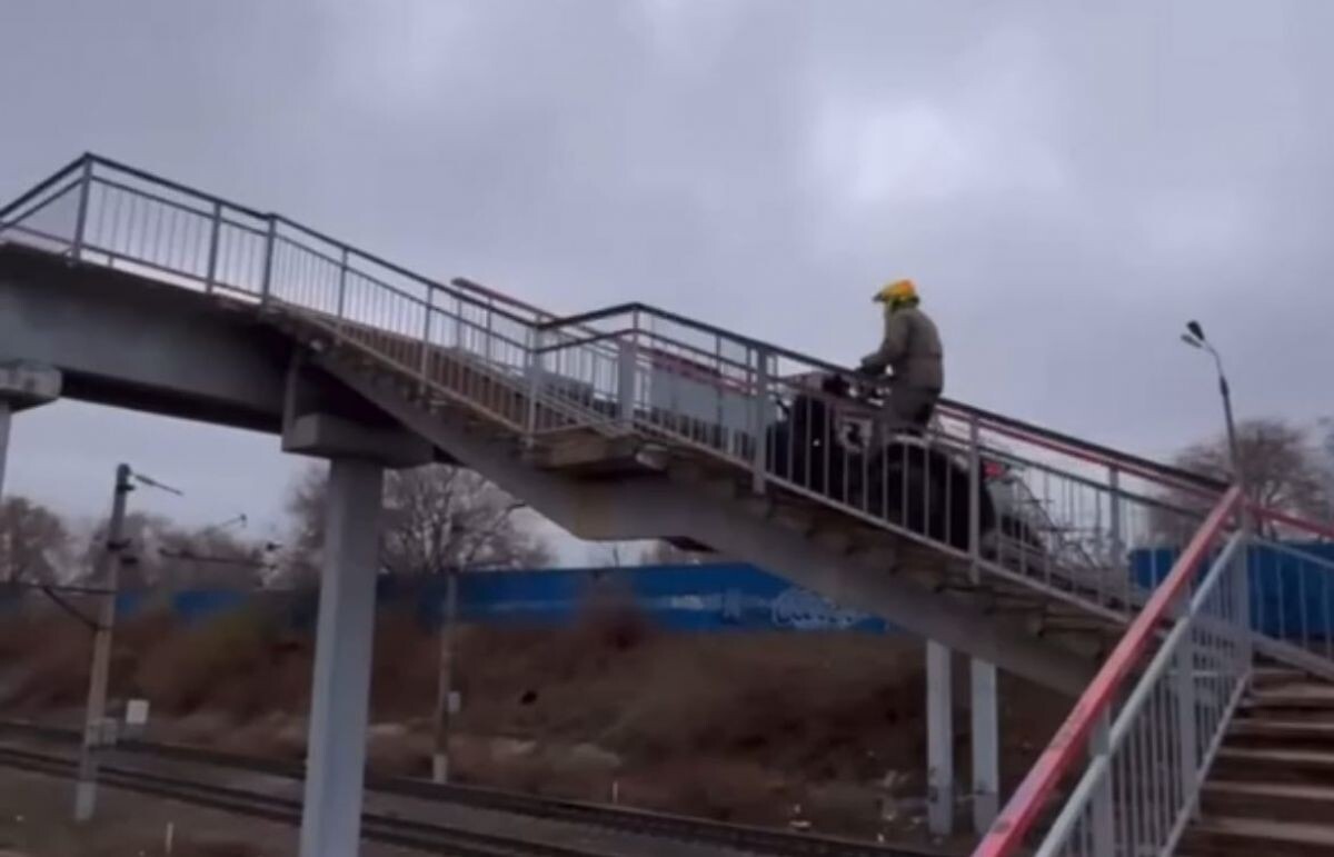 Судя по кадрам, мужчины на квадроциклах решили попробовать что-то новое - а именно проехаться по пешеходному переходу, расположенному прямо над железнодорожными путями. Лозунг трюкачи выбрали хоть и соответствующий, но с ошибкой: "Для гидроциклистов не существует преград".