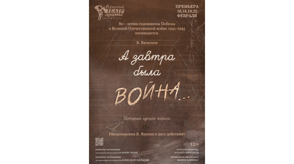 Брянские областные театры приступили к работе над новыми постановками. В репертуаре будут представлены как спектакли для взрослых, так и спектакли для детской аудитории. Зрители смогут насладиться оригинальными интерпретациями классических произведений, а также современными пьесами, которые затронут актуальные темы нашего времени. В Год защитника Отечества и 80-й годовщины Победы в Великой Отечественной войне 1941 – 1945 годов особое внимание Брянские театры уделили патриотической теме. Уже в феврале на сцене Брянского областного театра драмы им. А.К. Толстого состоится премьера восстановленного спектакля «А завтра была война…» (по повести Б.Л. Васильева в инсценировке Б.В. Ярыша). В марте свою премьеру покажет Брянский областной театр юного зрителя – «Рядовые» (по пьесе А. Дударева). Брянский областной театр драмы им. А.К. Толстого также сделал акцент на классические произведения. В плане театра постановки: «Лес» по пьесе А.Н. Островского, «Записки сумасшедшего» по повести Н.В. Гоголя