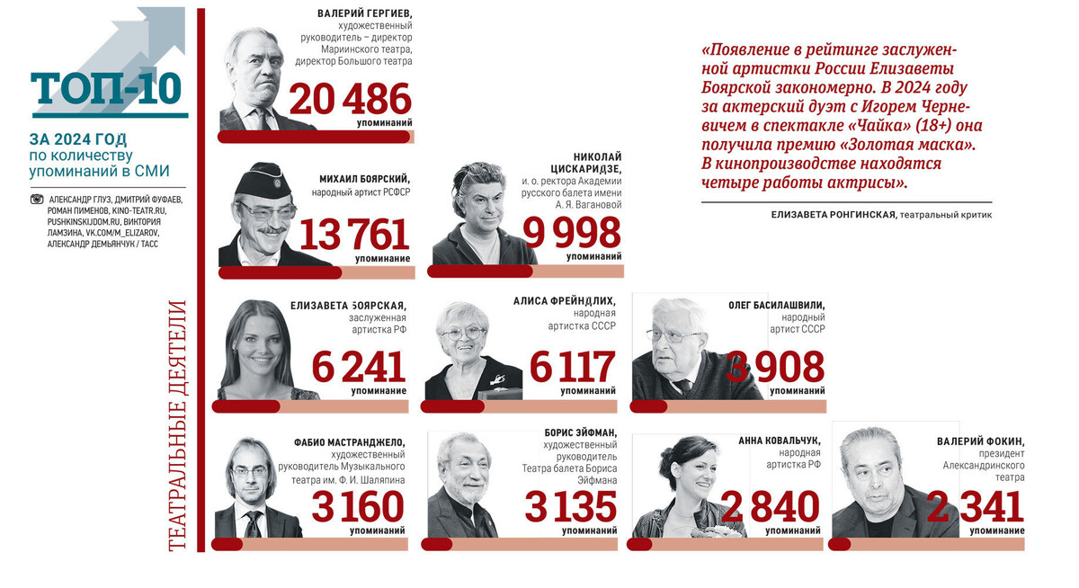 Художественный руководитель – директор Мариинского театра, директор Большого театра Валерий Гергиев стал самым упоминаемым в медиа среди петербургских театральных деятелей: его имя появлялось в СМИ в 2024 году 20 486 раз, следует из исследования «Медиалогии» и «Петербургского дневника».