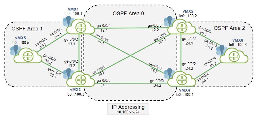 Настроим суммаризацию на vMX1 и vMX3 для area-0. После того, как мы это сделаем, мы должны увидеть только сводный маршрут 10.100.0.0/16 вместо 10.100.12.0, 10.100.14.0, 10.100.23.0, 10.100.34.0, 10.100.100.1, 10.100.100.2, 10.100.100.3 и 10.100.100.4. (Сети, входящие в зону 0)