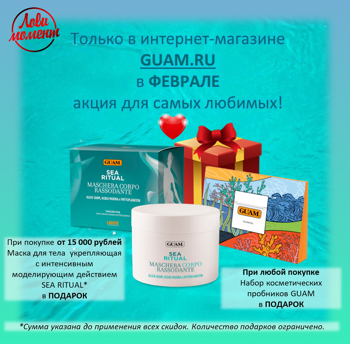 Ciao amici!🌺 ТОЛЬКО В ИНТЕРНЕТ-МАГАЗИНЕ GUAM.RU в ФЕВРАЛЕ АКЦИЯ ДЛЯ САМЫХ ЛЮБИМЫХ!❤️ 👉🏻При покупке от 15 000 рублей - Маска для тела укрепляющая с интенсивным моделирующим действием SEA RITUAL, 500 мл. в ПОДАРОК* 🎁 👉🏻При любой покупке - набор косметических пробников GUAM в ПОДАРОК 🎁 *Сумма указана до применения всех скидок. Количество подарков ограничено
