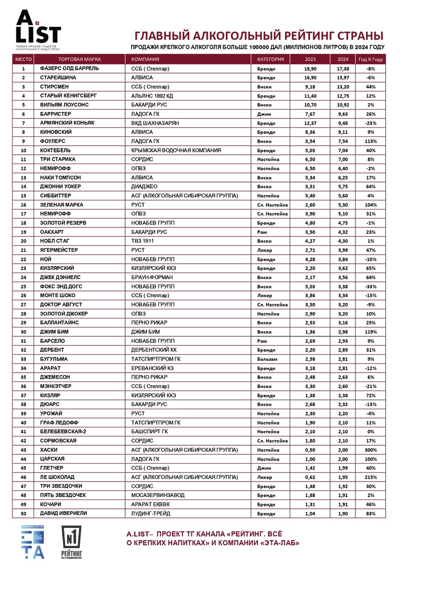 Очередной, уже третий по счету список «брендов миллионеров» A.LIST сформированный на основе данных о продажах, совместно нашими партнерами из аналитического агентства ЭТА.Лаб. Сегодня исключительно сухие цифры продаж, а наши комментарии, как и мнения других экспертов, будут опубликованы позднее, в обзорах по категориям напитков. В этот раз в список A.LIST были включены результаты продаж в двух растущих и популярных категориях — настойках и сладких настойках. Эти дополнения позволили предоставить более полную картину предпочтений покупателей. A.LIST уже сейчас отображает данные о продажах брендов начиная с 2020 года. Эти сведения полезны для участников алкогольного рынка, так как они позволяют отслеживать рыночные изменения и предпочтения потребителей. Как показывает опыт, популярность напитка невозможно обеспечить только за счёт рекламы, если он не нравится покупателям. Напоминаем, что список A.LIST составляется на основе данных о розничных продажах напитков: для водки это объемы в