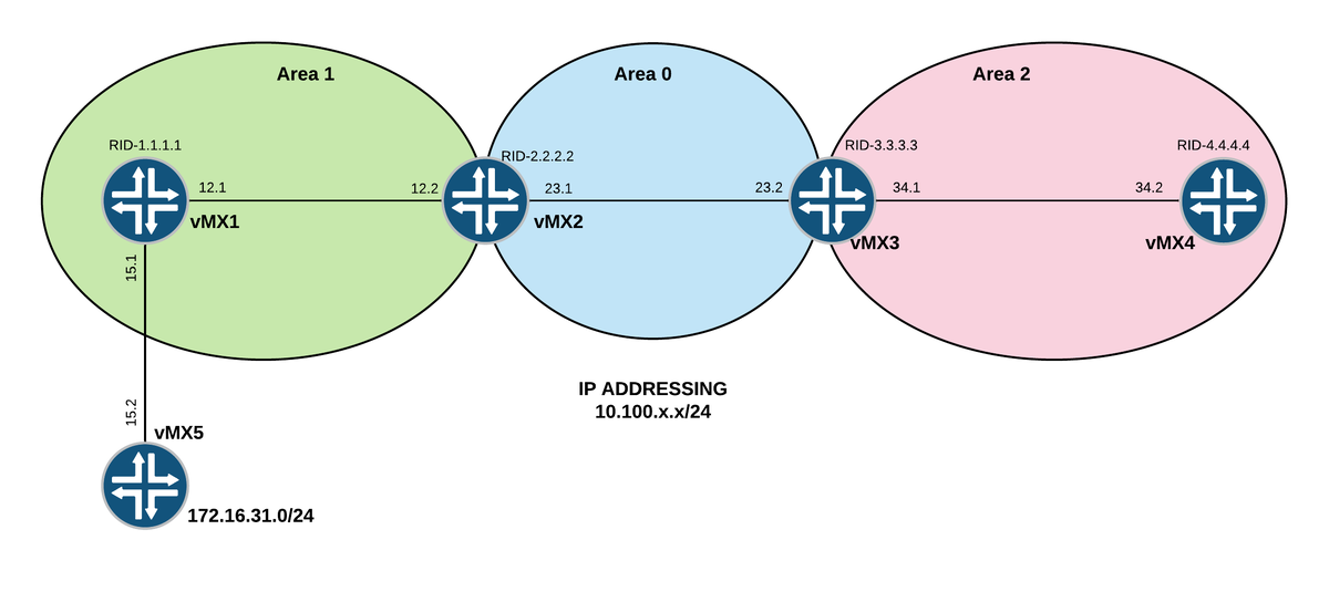 - vMX1 — это ASBR, так как он подключается к домену маршрутизации, отличному от OSPF.