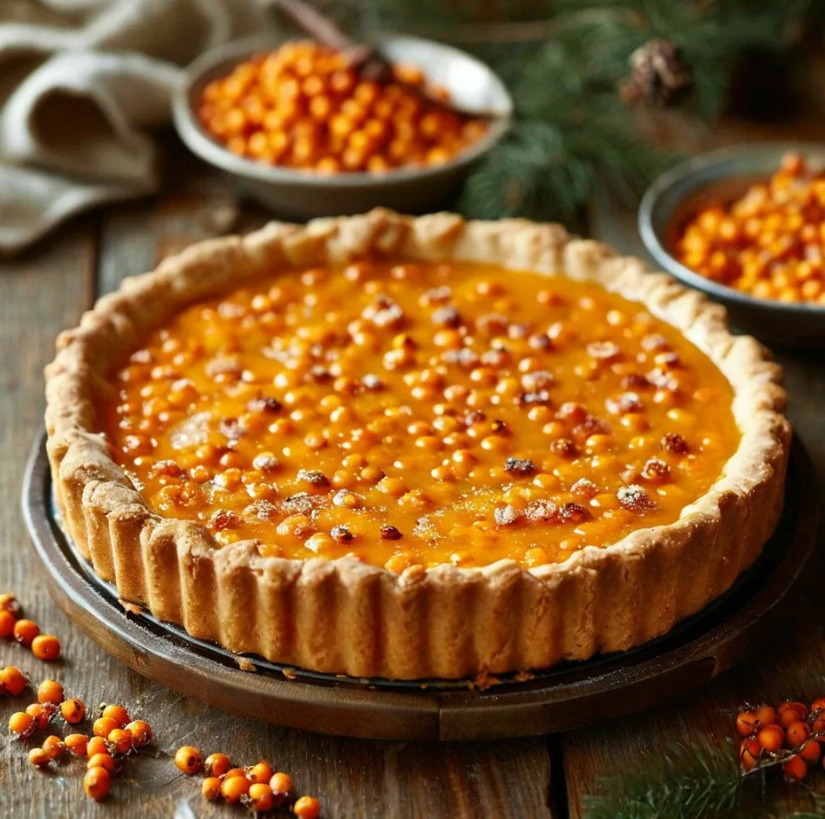 Вылейте начинку из облепихи на тесто. - Выпекание: Выпекайте пирог в разогретой духовке около 30-35 минут, пока начинка не загустеет, а тесто не станет золотистым.