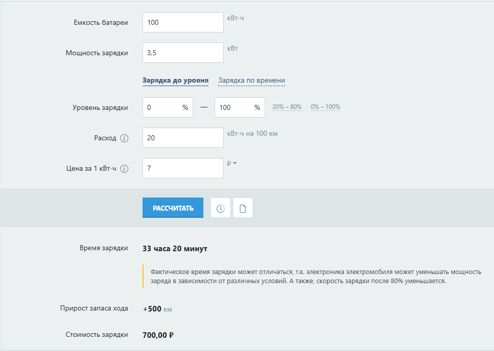 При зарядке от стандартной однофазной сети переменного тока 220В мощностью 3,5 кВт (большинство бытовых розеток рассчитаны на силу тока 16А) процесс зарядки будет очень медленным. При зарядке от стандартной розетки в доме на полную зарядку аккумулятора с емкостью 100 кВт·ч может уйти целых 33 часа. За это время вам придется потратить около 700 рублей на электроэнергию. Вывод: такая зарядка действительно занимает много времени. В результате расходы на 100 км пробега составят 140 рублей (