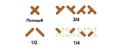 Появились новые виды креста (мне пока известно более 200 видов, но об этом ниже) и даже пол креста и четверть креста (Petite-stitch — это маленький крестик, размером в четверть основного крестика, т. е. в привычном квадратике канвы вышивается не 1 крестик, а 4 маленьких. В схеме вышивки 1/4 креста обозначаются следующим образом: в одной клеточке указывается 2 символьных значения или 1 символ, но маленький, в определенном уголке.