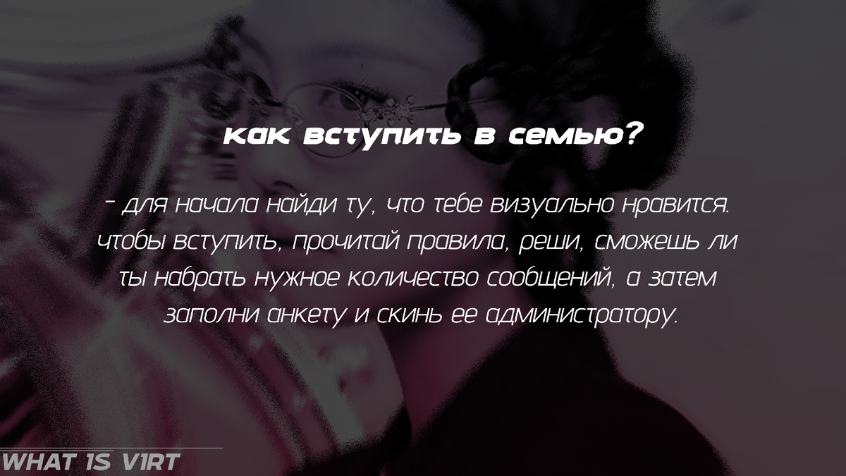 — Я хочу вступить в кф, но мало понимаю, как это сделать. Кираз, можешь объяснить? Конечно, мой котёнок! Итак, давай-ка сначала еще раз обсудим, что такое кф. Очень просто! Для начала найдем ту, что понравится. На разных платформах по-разному: в вк/инстаграм/пинтерест напишем в поиске "кф" или "вирт кф". В телеграм чуть сложнее - нужно найти канал "исд" - "ищу сп/друзей", поисковик - и просмотреть анкеты. Среди них вероятно есть парочка семей. Также, если вы публикуете анкету на исд, вы можете написать, что хотите в кф. Тогда кто-нибудь вас пригласит! Перво-наперво посмотрите канал - все ли хорошо, нравится ли вам, какие есть правила. Дальше нужно найти и заполнить анкету (если она у них есть), а потом отправить ее администратору. Имя, фамилию, возраст, ориентацию, позиция, статус (вы в отношениях или свободны), а также еще очень много. Анкеты бывают разные - от очень простых, до слишком сложных. Лучше задайте вопрос админу, если сомневаетесь, как заполнять. А еще можете напис