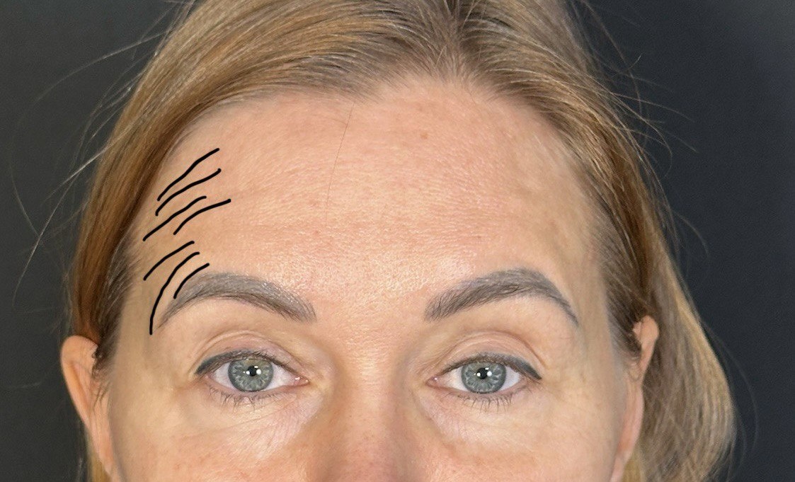 На этом фото как раз пациентка с гипертонусом бровей до операции. Черными линиями обозначил специфические заломы, которые образуются в следствии гипертонуса.