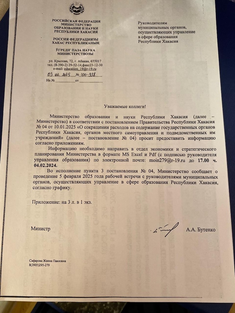 Медиаархангелу Хакасии из администрации одного из районов Хакасии прислали любопытный документ, от которого на ушах стоят в школах и детсадах республики. В письме, которое разослано во все города и районы, министр образования Хакасии Анатолий Бутенко просит предоставить предложения о сокращении штатной численности сотрудников школ и дошкольных учреждений.