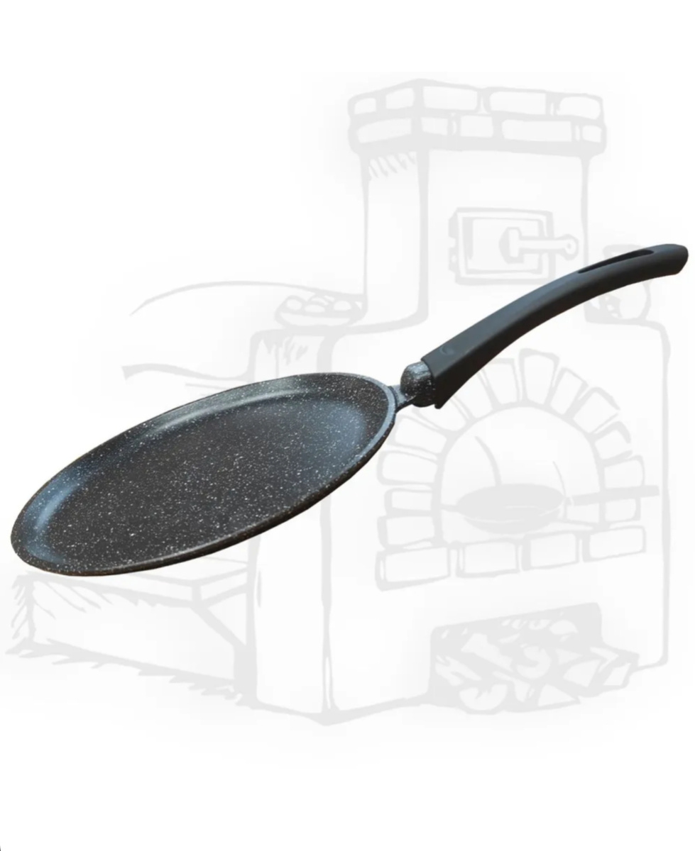 Новая блинная сковорода. Как говорится в описании товара, он сделан в России. Приехал с Озон. Бренд GOODGRILL. По цене хорошо. Абсолютно круглая, безупречно ровная. Выглядит эстетично, современно. На все сто антипригарная. Покрытие - трёхслойный GREBLON. Производитель обещает полную безопасность покрытия, даже при его повреждении. Рассчитана на 20 тысяч циклов. Моется в посудомоечной машине. Может использоваться не только на газовой плите, но и на других вариантах - керамическая, галогенная, электрическая. Весит 600 г. Донышко 4,5 мм толщиной. Стенки - 3,5 мм. По наружному краю, т. е. наибольший внешний диаметр 22 см, а внутренний диаметр дна 17,5-18,1 см. Диаметр вот такой оптимален для блинчика. Блинок получается не слишком огромный, и не мелкий. Большие тяжело переворачивать, а малые долго печь. Вместе с ручкой, длина 42,5 см. Высота 1,5 см Заявленный состав - пищевой алюминий. Корпус литой. Соответствует всем стандартам данного вида посуды. Ручка зафиксирована, не съёмная. Н