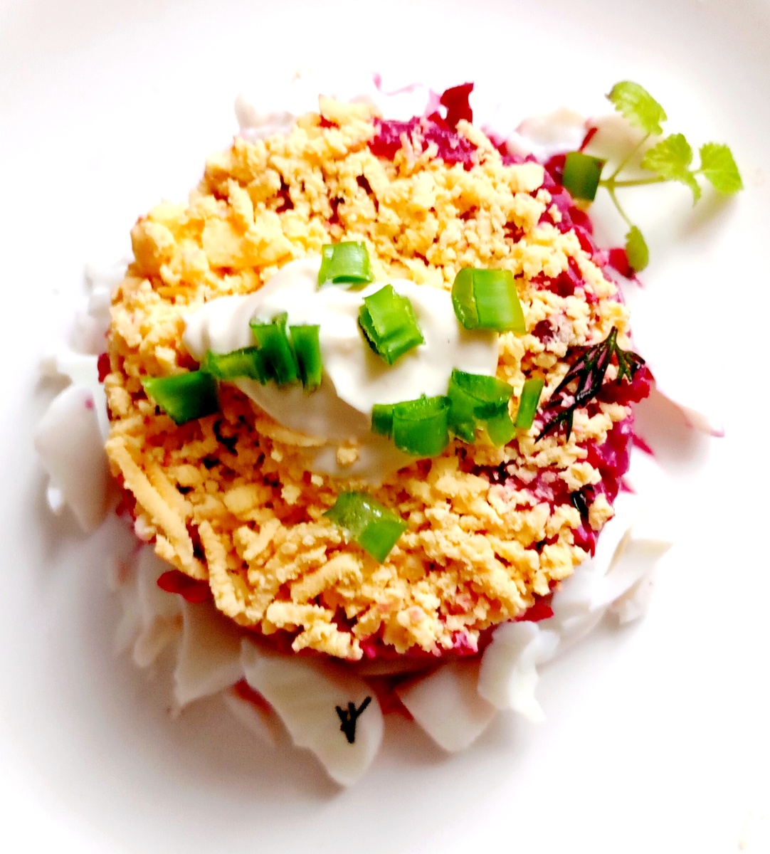Еда домашняя,кулинария дома Из моего январского меню. Для салата мне понадобилось; Свеклу натёрла на крупной тёрке. Сварила яйца,охладила в холодной воде,чтобы чистились яйца без проблем. Нарезала мелко и добавила к свекле. Добавила зелёный горошек,жидкость слила. Нашинковала лук зелёный, петрушку. Мы любим свекольный салат с чесноком,поэтому добавила пару небольших зубчика чеснока,натёрла на мини-тёрочке. Всё ингредиенты перемешала,немного посолила,поперчила. Добавила майонез.И ещё раз перемешала. После того как я сварила свёклу,не сливая отвар,добавляю либо ложечку уксуса,или лимонную кислоту. Свекла тогда вбирает в себя цвет и не будет бледной.И вот так будет улыбаться! Свёклу можно не только варить для салата с добавлением воды,а лучше запечь в фольге, или сложить в пакет,добавить воды. Немного добавить соли, положить пакет в посуду для микроволновки, поставить на 7-10 минут в микроволновку, и свекла готова. Салат подала с зеленью,сверху натёрла желток и по низу ввложила белки я
