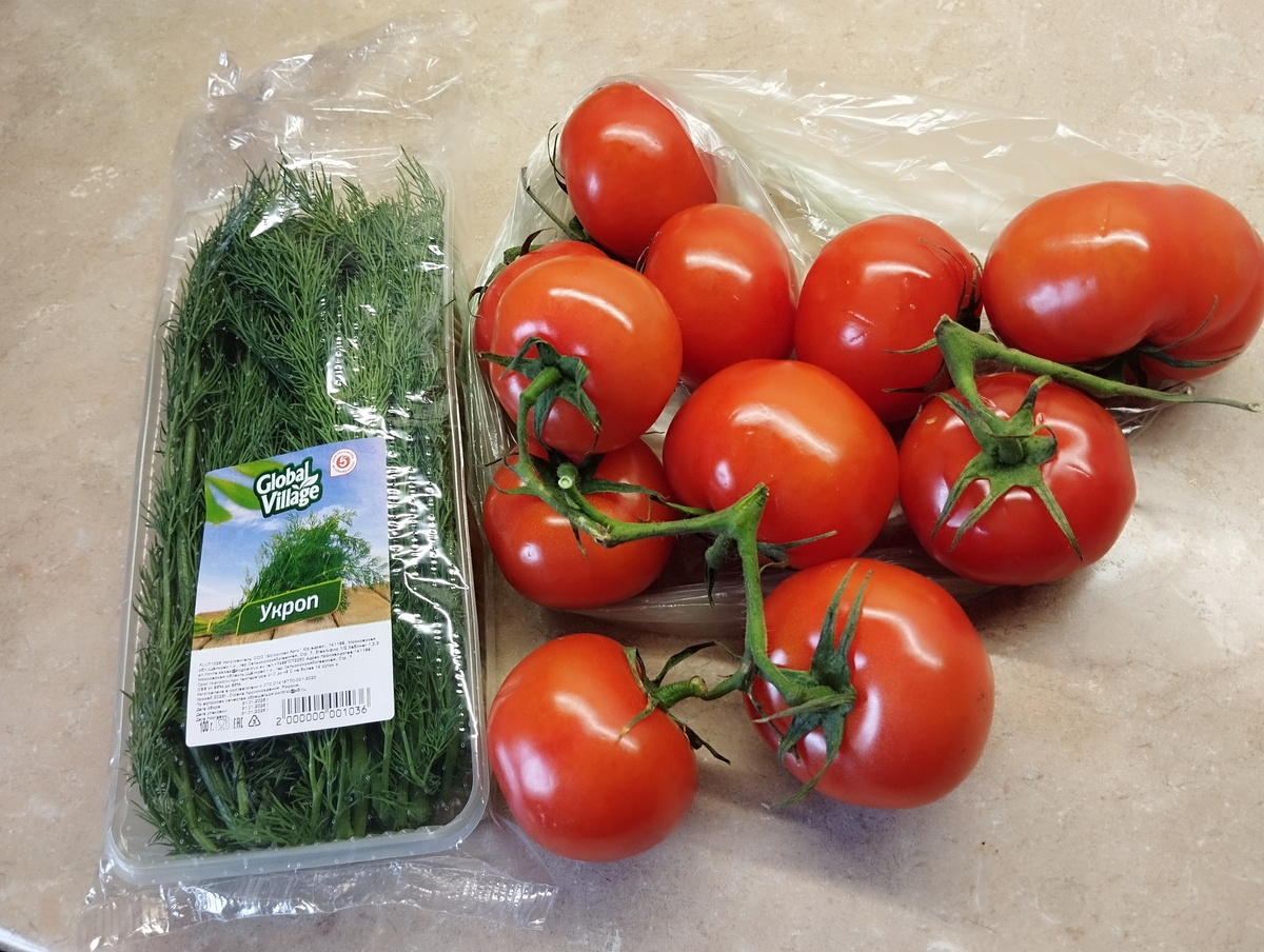 В этом году я не делала заготовки помидор, у меня оставались баночки ассорти с огурцами. Но сейчас захотелось соленых помидор, а в банке с огурцами их как-то мало. Увидела сегодня красивые помидорки на ветках в магазине, и они даже пахли помидорами. Но, к сожалению, они оказались жесткие и кислые, и я решила их замалосолить. Купила к ним пучок укропа. Этим рецептом пользуюсь давно, помидоры получаются вкусные, самое сложное дождаться до завтра, когда они хорошо промаринуются. Нужно 10-15 помидоров, маринад делаем на 2 литра воды. Складываем все в большую кастрюлю. Пушистые веточки укропа я оставила на салаты, остальное положила в маринад. На 2 литра воды: 3 стл соли 8.5 стл сахара 4 стл уксуса 9% 3 зубчика чеснока продавить через пресс черный перец горошком укроп Накалываем помидоры вилкой, закладываем в маринад. Накрываем крышкой и ставим вариться. Как закипит, выключаем огонь и, не поднимая крышку, оставляем до завтра. За это время в горячем маринаде помидоры хорошо промаринуются, п
