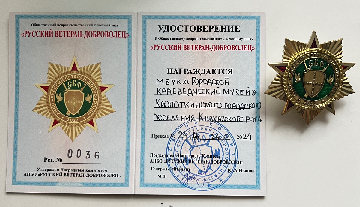 Кропоткинский городской краеведческий музей награжден почётным знаком «Русский ветеран-доброволец»