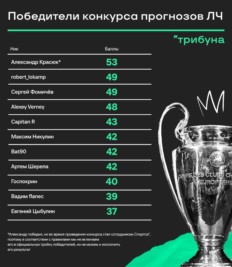 Привет! Мы запустили конкурс прогнозов на Трибуне в сентябре 2024 года. С этого момента несколько месяцев подряд мы следили за Лигой чемпионов вместе с вами и наблюдали за тем, что будет дальше. Спасибо, что делились прогнозами в комментариях и обсуждали матчи – борьба за призовые места шла до последнего тура! Результаты последнего дня прогнозов оставили в комментариях к материалу, в котором их и собирали, а сейчас сразу переходим к финальным результатам. Итоговая таблица Важное уточнение. При равенстве баллов в итоговой таблице мы обращали внимание на то, кто первым сделал прогноз в конкурсе. Полную таблицу с результатами всех участников за все дни мы тоже собрали – ее можно посмотреть здесь. Результаты Третье место с результатом 48 баллов занимает Alexey Verney и получает в подарок сувенирный мяч ЛЧ 24/25. Второе место и фирменная футболка ЛЧ за 49 баллов в турнирной таблице улетает к Сергею Фомичёву Первое место и результат 49 баллов – победителем конкурса становится robert_lokamp и
