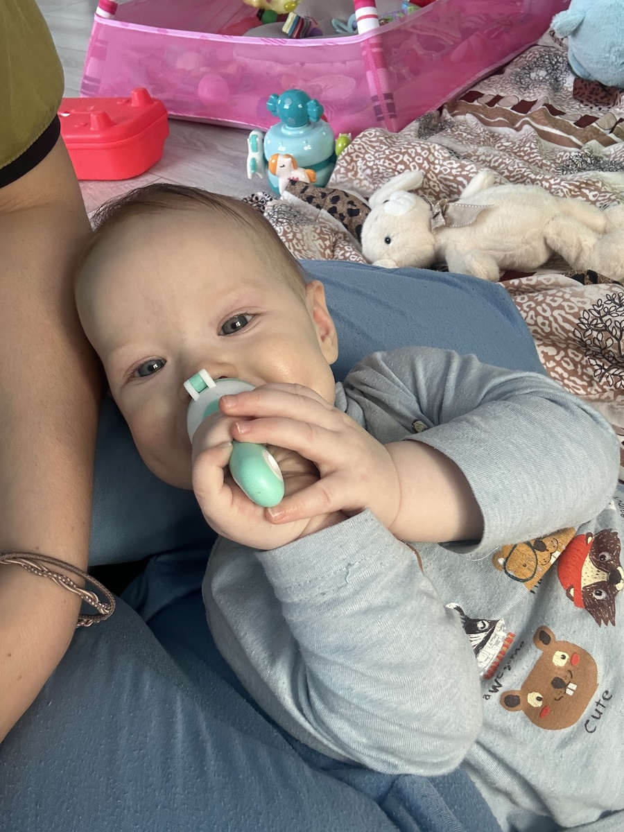 Ксюша сегодня немного капризничала. Верхние зубы почти полностью проклюнулись. Спасаемся игрушками-грызунками, щётками и ниблером. Сегодня в ниблер ей морковку сырую закладывала. Хорошо погрызла, лёжа на мне. 😊