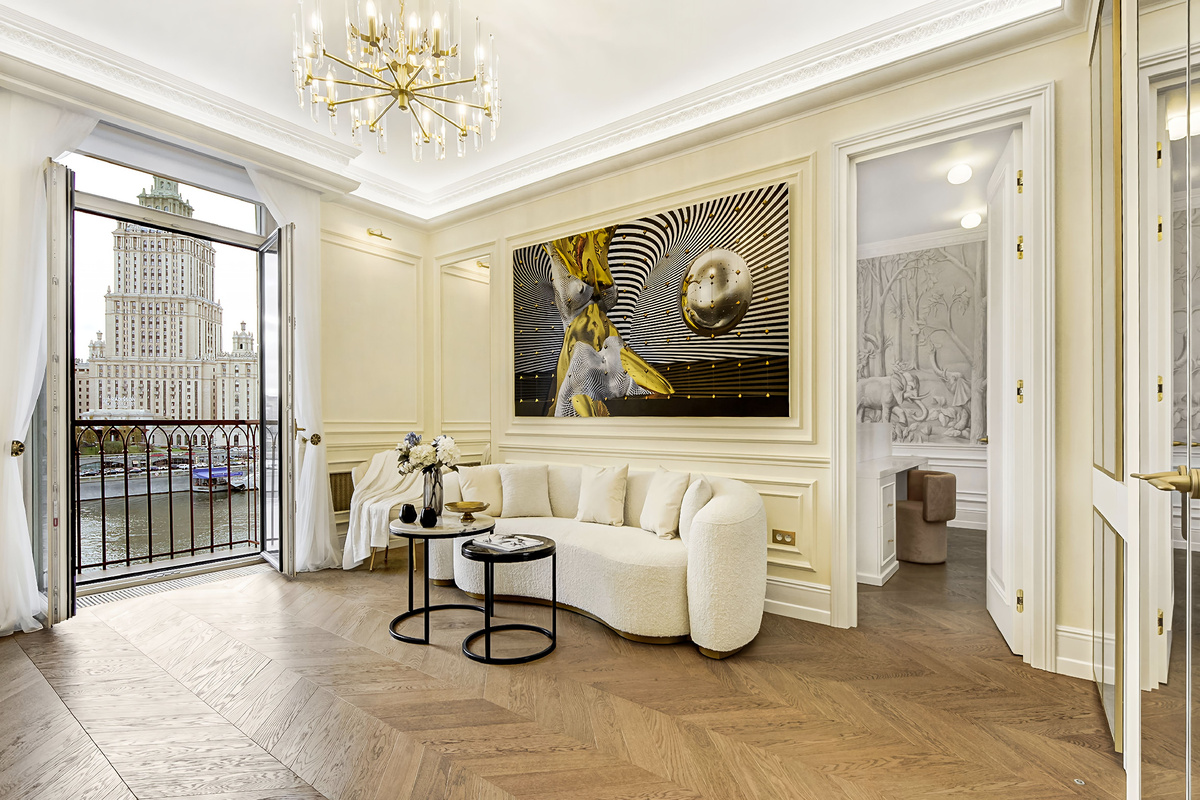 В интерьере сочетаются элементы современной классики и парижского шика: изящные молдинги, распашные окна, натуральный камень и дерево, зеркальные акценты. Цветовая гамма светлая, воздушная, при этом в каждом помещении царит своя уникальная атмосфера.