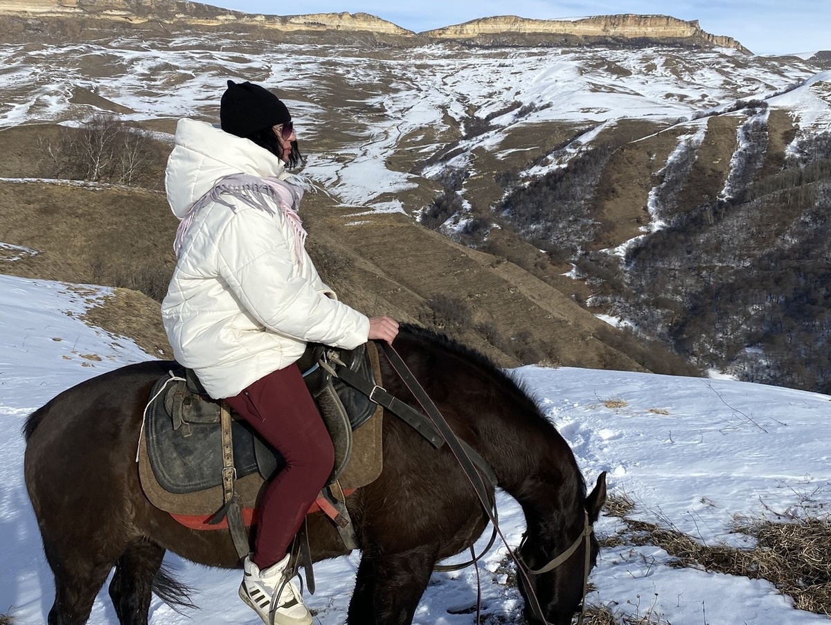 В какой-то момент Маша решает идти пешком. Они с Валерием держа коней в поводу идут тропинке. Мы же с Зайчиком решаем «рискнуть» и спускаемся по снежному склону. Снегу по колено. Идем медленно и аккуратно. Стараюсь максимально не мешать коню.