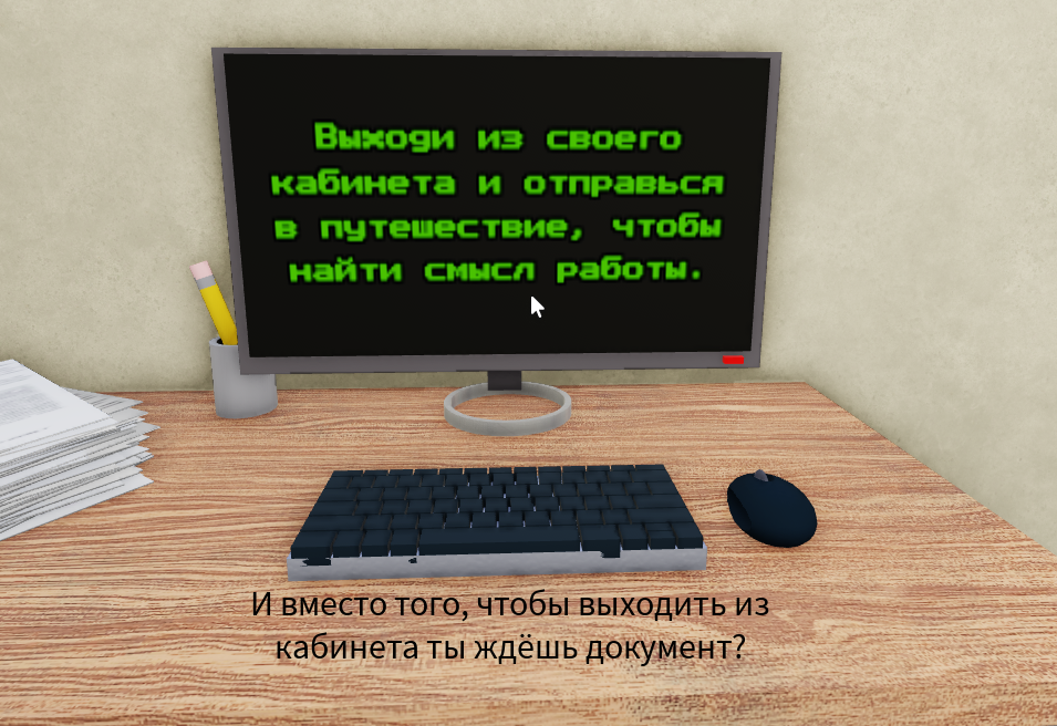 Всем здравствуйте! Сегодня я вам расскажу о всех концовках игры "Смысл работы Алекса". Если вы не знаете что это, то прочитайте эту статью: Нажмите сюда. Начинаем! КОНЦОВКИ В КАБИНЕТЕ АЛЕКСА: Концовка ожидания Когда вы попадёте в свой кабинет не выходите из него. Подождите пока Рассказчик договорит свой монолог и сядьте за стол. Рассказчик будет возмущён и выбросит вас из игры. Концовка вентиляции Когда вы попадёте в свой кабинет, подождите пока рассказчик закончит монолог. После залезайте в вентиляцию и не вылезайте. Рассказчик заколотит выход из вентиляции досками, а потом обустроит "Новый дом Алекса". КОНЦОВКИ ВЫБОРА МЕЖДУ ДВУМЯ ДВЕРЯМИ Запутанная концовка Когда откроется дверь выходите и идите в левую дверь, не поворачивайте на право и дальше идите вперёд. Вы встретите сломанный коридор с тупиком. После этого Рассказчик перезапускает игру. На этот раз офис выглядит странно. Свет пропал. Стены, пол и потолок окрашены в яркие цвета. На этот раз останется только левая дверь, за кото