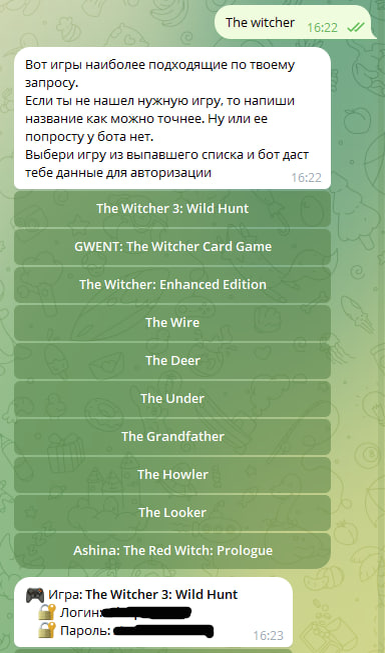 - Бот подбирает аккаунт с этой игрой и отправляет вам данные для входа.