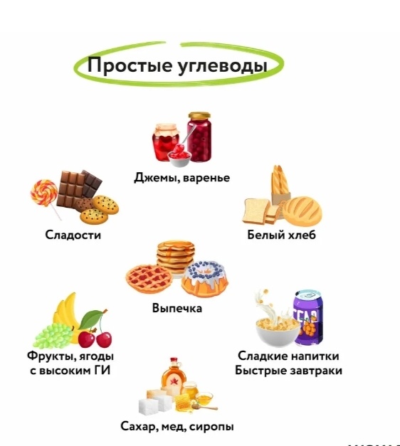 простые углеводы: состоят из 1 или 2 молекул сахара и быстро усваиваются организмом, это сахароза, фруктоза, глюкоза, лактоза •мёд •сахар •фрукты •ягоды •молоко сложные углеводы: состоят из длинных цепочек молекул сахара, усваиваются дольше, к ним относятся крахмал и клетчатка •рис •гречка •булгур •манка •мука •пшено •картофель •овсянка •киноа •перловка •овощи •так же все бобовые, семена и орехи сложные углеводы по большей части- крахмал, все крупы на 60-70% состоят из него, остальное зависит от кол-во микроэлементов и клетчатки клетчатка является сложным углеводом, при этом она почти не усваивается организмом, но помогает нашему ЖКТ с переработкой пищи и поддерживает здоровье кишечника, так же отлично насыщает, больше всего клетчатки в таких крупах как гречка, овсянка, перловка, так же все бобовые, орехи и семена. сложные углеводы такие как белый рис, манка, мука расщепляются быстро и их принято считать быстрыми углеводами, отчасти потому что в них почти нет клетчатки, в отличие от