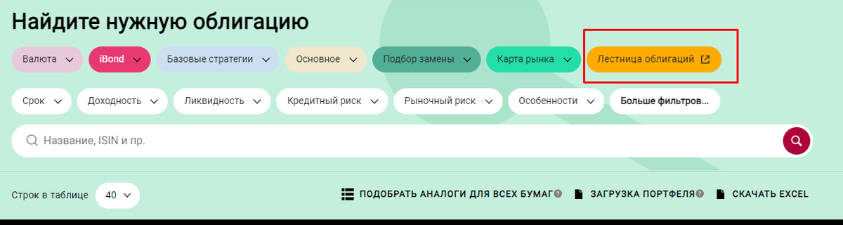 Одним из удобных сайтов по отбору облигаций является https://www.dohod.ru/analytic/bonds И недавно на нем появилась такая функция, как лестница облигаций: После регистрации доступно больше функций, но все равно в бесплатной версии не все параметры можно менять. Бесплатно лестницу можно собрать на ближайшие 3 года: Можно выбрать кредитный риск облигаций и другие параметры: Для совсем новичков сервис может быть удобен, но для составления хорошего портфеля бесплатной версии точно не хватит. Подписывайтесь на Telegram канал