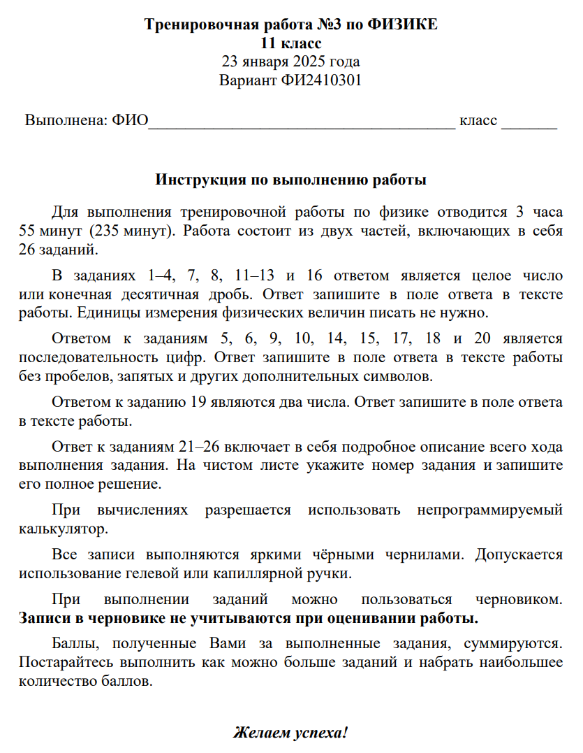 Для выполнения тренировочной работы по физике отводится 3 часа 55 минут (235 минут). Работа состоит из двух частей, включающих в себя 26 заданий. В заданиях 1–4, 7, 8, 11–13 и 16 ответом является целое число или конечная десятичная дробь. Ответ запишите в поле ответа в тексте работы. Единицы измерения физических величин писать не нужно. Ответом к заданиям 5, 6, 9, 10, 14, 15, 17, 18 и 20 является последовательность цифр.