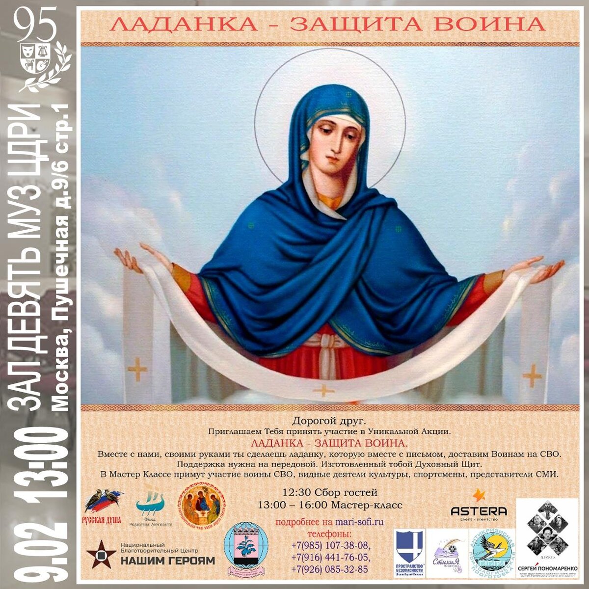 «ЛАДАНКА — ЗАЩИТА ВОИНА» Вместе с нами, своими руками ты сделаешь ладанку, которую вместе с письмом, доставим Воинам на СВО. Поддержка нужна на передовой. Изготовленный тобой Духовный Щит. В Мастер-классе примут участие воины СВО, видные деятели культуры, спортсмены, представители СМИ. Сбор гостей — 12:30