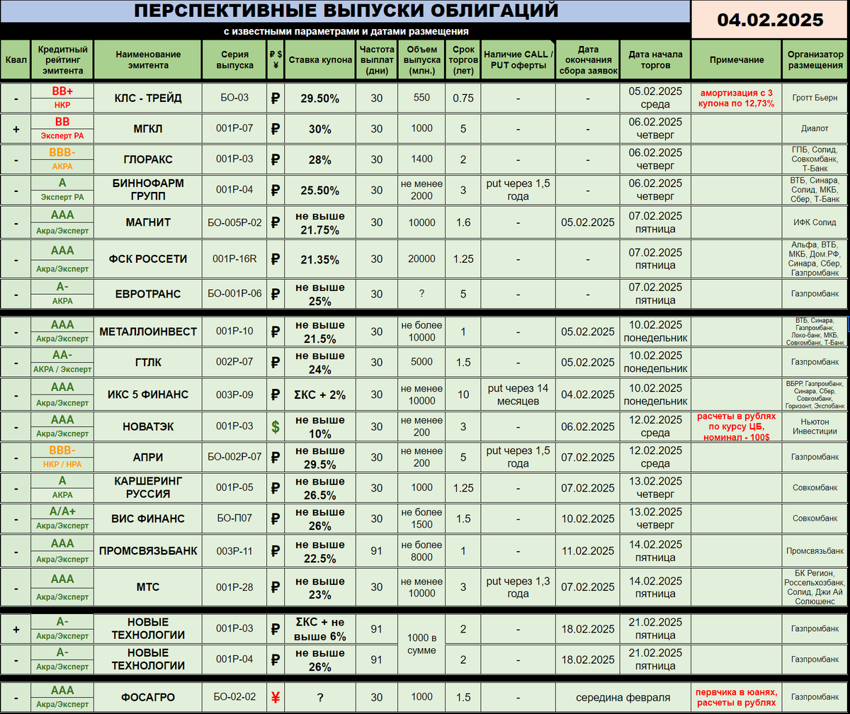 ✌️ Анонсов размещений столько, что немножко закипаю :) Тем не менее, постараюсь все упорядочить, авось получится :) ---------- 🆕 НОВЫЕ РАЗМЕЩЕНИЯ / АНОНСЫ: ❄️ Давайте-ка по датам сбора свежие анонсы распределим. Итак, завтра, 5 февраля: - Начнет торги выпуск БО-03 эмитента КЛС-ТРЕЙД (🅱️🅱️➕). Заявки можно подать до обеда, а уже после получить бумагу в портфель. Выпуск призван поддержать краткосрочный долг компании, как я понимаю: 550 миллионов рублей, 9 месяцев торгов всего, оферт нет, ставка ежемесячного купона - 29.5%, амортизация с 3-го купона по 12,73%. Вообще мне кажется, что ставка нерыночная, премии за срочность не видно вовсе, а деньги компании явно очень нужны. Подозреваю, что профильные кредитные организации подобную сумму готовы дать процентов под 40. Организатор - ГроттБьерн. - Сбор заявок проведет МАГНИТ (🅰️🅰️🅰️). Да, опять! Выпуск серии БО-005Р-02, объем не менее 10 миллиардов рублей, 1,6 года торгов, ежемесячный купон с ориентиром не выше 21,75%, оферт нет. На