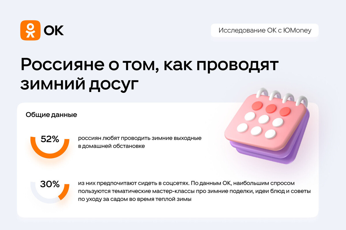 Соцсеть «Одноклассники» и ЮMoney выяснили, как россияне проводят свой досуг зимой, сколько тратят на развлечения и какой контент чаще всего смотрят в соцсетях. По данным опроса, 52 процента любят проводить выходные в домашней обстановке, 30 процентов предпочитают сидеть в соцсетях.