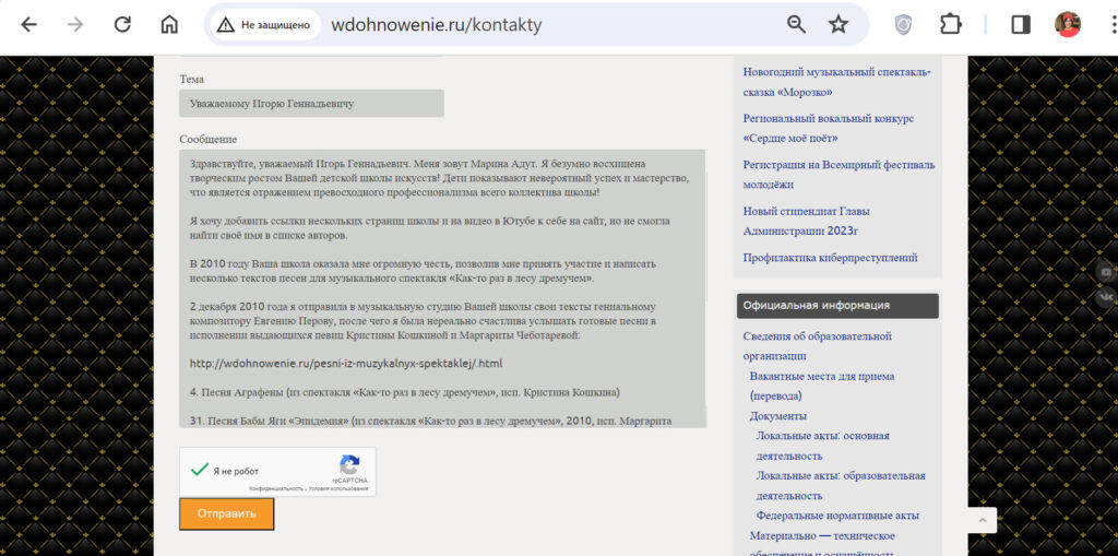 2 Фев 2024 - 13:48 Сегодня написала письмо уважаемому Помазкину Игорю Геннадьевичу: Здравствуйте, уважаемый Игорь Геннадьевич. Меня зовут Марина Адут. Я безумно восхищена творческим ростом Вашей детской школы искусств! Дети показывают невероятный успех и мастерство, что является отражением превосходного профессионализма всего коллектива школы! Я хочу добавить ссылки нескольких страниц школы и на видео в Ютубе к себе на сайт, но не смогла найти своё имя в списке авторов. В 2010 году Ваша школа оказала мне огромную честь, позволив мне принять участие и написать несколько текстов песен для музыкального спектакля «Как-то раз в лесу дремучем». 2 декабря 2010 года я отправила в музыкальную студию Вашей школы свои тексты гениальному композитору Евгению Перову, после чего я была нереально счастлива услышать готовые песни в исполнении выдающихся певиц Кристины Кошкиной и Маргариты Чеботаревой: http://wdohnowenie.ru/pesni-iz-muzykalnyx-spektaklej/.html 4. Песня Аграфены (из спектакля «Как-то раз