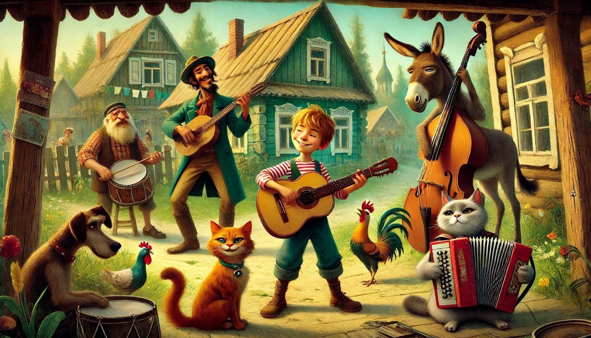 Дядя Фёдор, уже повзрослевший юноша с пытливым умом и жаждой свободы, однажды решил, что городская жизнь больше не для него. Он мечтал о приключениях, о новых горизонтах и, конечно, о музыке. Взяв своего верного друга — кота Матроскина, который, как всегда, был готов поддержать его в любом начинании, дядя Фёдор отправился в деревню Простоквашино. В деревне их встретил пёс Шарик, который уже давно жил там и знал каждую тропинку. Шарик был рад новым друзьям и сразу предложил помочь обустроиться. Чуть позже к компании присоединились петух, мечтавший стать знаменитым певцом, и ослик, который играл на гитаре и пел грустные песни о своей одинокой жизни. Вместе они поселились в старом доме на окраине деревни. Сначала жизнь в деревне казалась им спокойной и даже немного скучной. Но по вечерам, собравшись вместе, они начинали петь и играть на инструментах. Дядя Фёдор играл на гитаре, Матроскин — на контрабасе, Шарик — на барабанах, петух пел, а ослик аккомпанировал на аккордеоне. Их музыка была