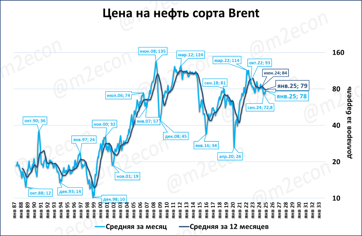 Наблюдение: среднегодовые цены полтора года (18 месяцев) находились в диапазоне 80-85 долларов. Сейчас они вышли из этого диапазона, но незначительно.