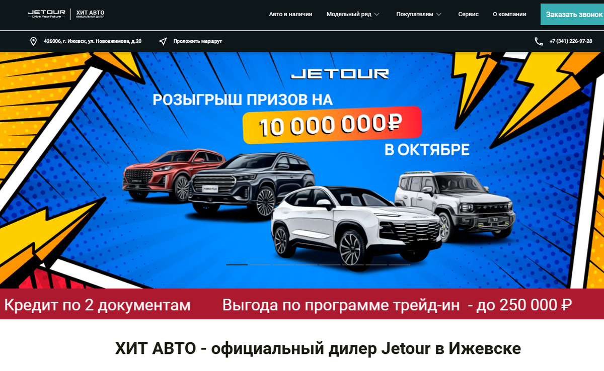 Приветствуем всех, кто ищет новые автомобили по выгодным ценам! Автоцентр Джетур-Хит Авто, который расположился по адресу: город Ижевск, улица Новоажимова, 20. Данный автосалон предлагает автомобили по низким ценам и обращает на себя внимание людей, которые находятся в поиске нового автомобиля. Автосалон Джетур-Хит Авто позиционирует себя как автоцентр по продаже новых автомобилей китайской марки Джетур. На сайте Джетур-Хит Авто есть несколько интересных акции и спецпредложений для новых клиентов, например, есть возможность приобрести автомобиль по ставке от 10% на срок до 7 лет, или при сдаче своего автомобиля в trade-in клиент может получить скидку до 250 000 рублей. Цены на новые автомобили в данном автосалоне в среднем на 30-40% ниже рыночных, что делает предложение Джетур-Хит Авто очень привлекательными для тех клиентов, кто рассматривает для покупки именно новые автомобили. Редакции нашего канала приглянулся один из автомобилей, размещенных на сайте, и мы приняли решение отправит