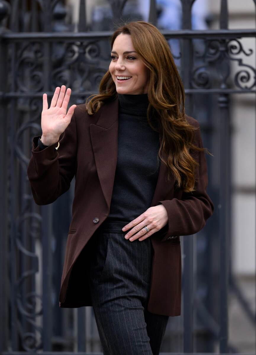 Кейт выглядела элегантно в коричневом пиджаке, брюках и чёрной обуви на каблуке.