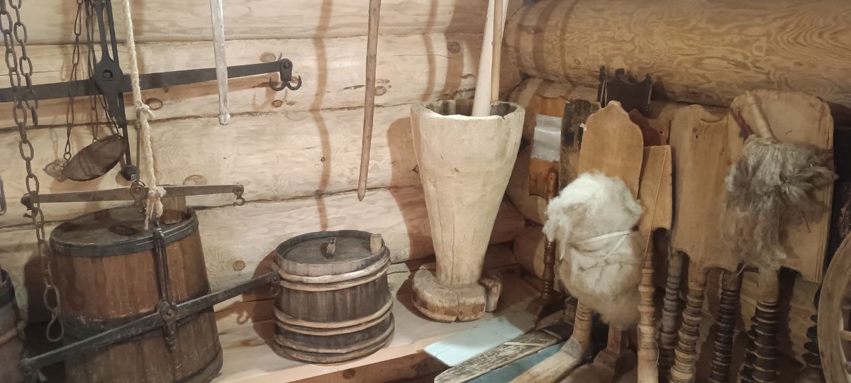 Ушаты для бани и снопы льна если не ошибаюсь. В здешних местах активно выращивали лен для продажи и собственных нужд. ТО есть изготовление нитей и далее на ткацком станке тканей. Конечно же данное ремесло сложное и нужно было приложить немало времени и усилий что бы изготовить такую ткань.