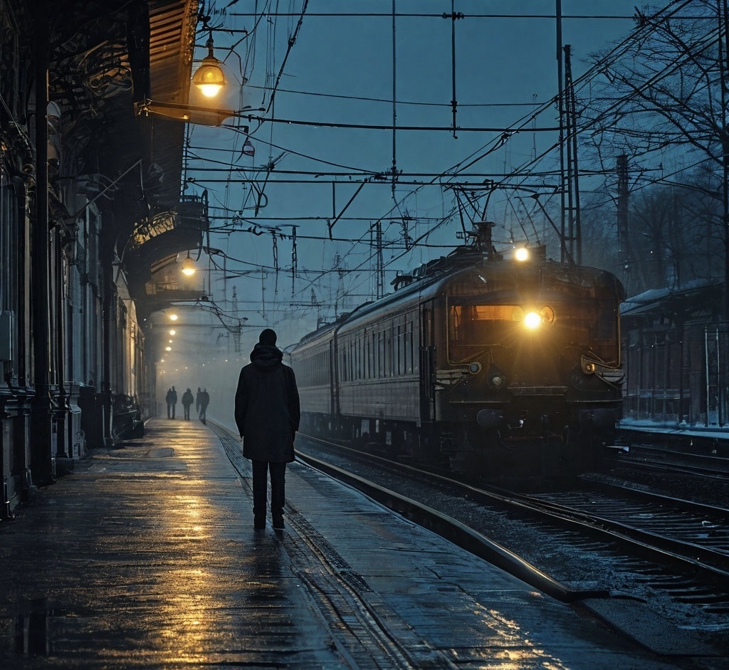 Город был погружён в ночь. Улицы пустели, фонари мерцали, как усталые глаза, а ветер гнал по тротуарам клочки бумаги и опавшие листья. На вокзале, где время, казалось, застыло, стоял одинокий поезд. Его вагоны, некогда яркие и ухоженные, теперь выглядели потрёпанными, с облупившейся краской и потускневшими окнами. Это был последний поезд, отправлявшийся в никуда. Марк стоял на перроне, сжимая в руке билет. Он не знал, зачем пришёл сюда. Может, из любопытства, а может, потому, что в его жизни больше не осталось ничего, что могло бы удержать его в городе. Работа потеряна, друзья разъехались, а семья... Семья давно перестала быть его опорой. Он взглянул на часы. Полночь. Поезд должен был отправиться через десять минут. Марк подошёл к ближайшему вагону, где стоял проводник — пожилой мужчина в форме, которая, казалось, висела на нём, как на вешалке. "Билет," — протянул Марк. Проводник взглянул на него, и в его глазах промелькнуло что-то странное — смесь жалости и предостережения.