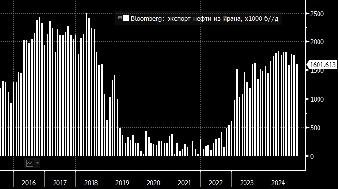 Источник: Bloomberg. Помесячная динамика экспорта сырой нефти из Ирана.