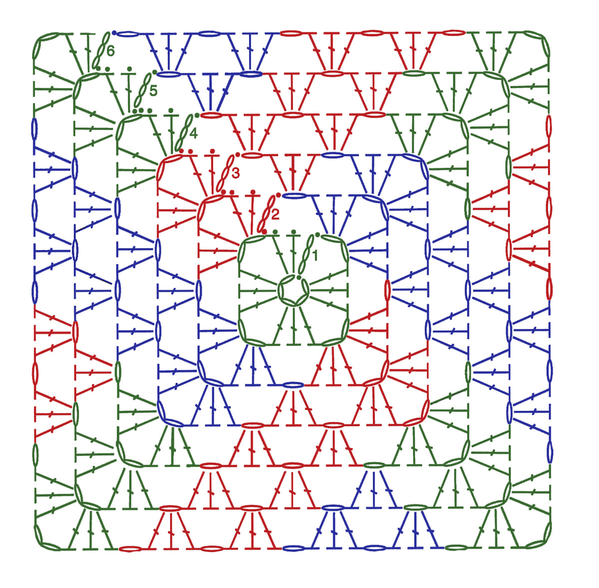 Давно уже я не пополняла свою коллекцию Бабушкиных квадратов. А вчера увидела его и с радостью приступила к экспериментам. Подробнее о самом квадрате - это классический Бабушкин квадрат, но связанный по определенной цветовой схеме. Линейным я его назвала потому что если смотреть на один мотив, то четко видны разноцветные линии. А вот множество рамок можно увидеть только если собрать из таких мотивов полотно. Схема классическая, главное правильно связать его в цветном исполнении. Всего 3 цвета. Какие цвета - решайте сами. Цвет первого ряда - это будет фоновый цвет. А остальные два цвета - это цвета рамок. Давайте рассмотрим схему более подробно. Я взяла золотой цвет, розовый и бардовый. Всего в мотиве 6 рядов. Первый ряд вяжем одним цветом - это будет цвет фона Во втором ряду противоположные углы вяжем одинаковыми цветами, а соседние, соответственно, разными. Эти цвета будут цветами пересекающихся рамок. В третьем ряду угол вяжем тем же цветом, что и в предыдущем, а также сторону пе