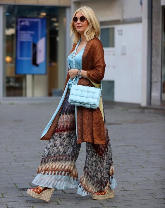 Весна – время свежести, молодости и обновления, и именно в это время года каждая женщина начинает перебирать свой гардероб и обновлять его, добавляя более яркие, более необычные и более женственные вещи для самых эффектных стильных образов. 1. Широкие до легкой экстравагантности пестро-полосатые льняные брюки и обманчиво-лаконичная бледно-голубая блузка – хороший вариант для встречи весны. Помимо ярких по цвету и фасону брюк нотку необычности в образ вносит длинный блестящий золотисто-коричневый с тонкой голубой полосой отделки шарф-палантин, наброшенный на плечи. Завершают образ темно-коричневые сандалии на высокой танкетке. 2. Блестящие оливково-зеленые узкие брюки-сигареты с широким кожаным ремнем позволяют зрелой даме за 50 выглядеть изящно и эффектно. Гармоничный ансамбль этой модели брюк составляет темная блузка с розово-зеленым цветочным принтом и строгий матово-черный жакет-пиджак. Сочетающаяся с жакетом и завершающая образ деталь – черные ботильоны с квадратными носами и на вы