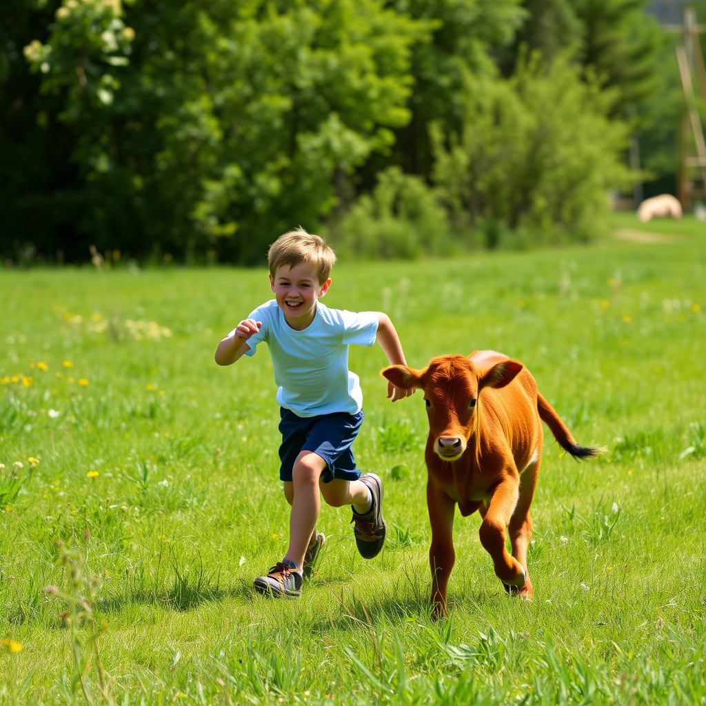 Бегают Серёжа с телёночком по лугу цветущему, тепло им, солнышко так ярко светит...